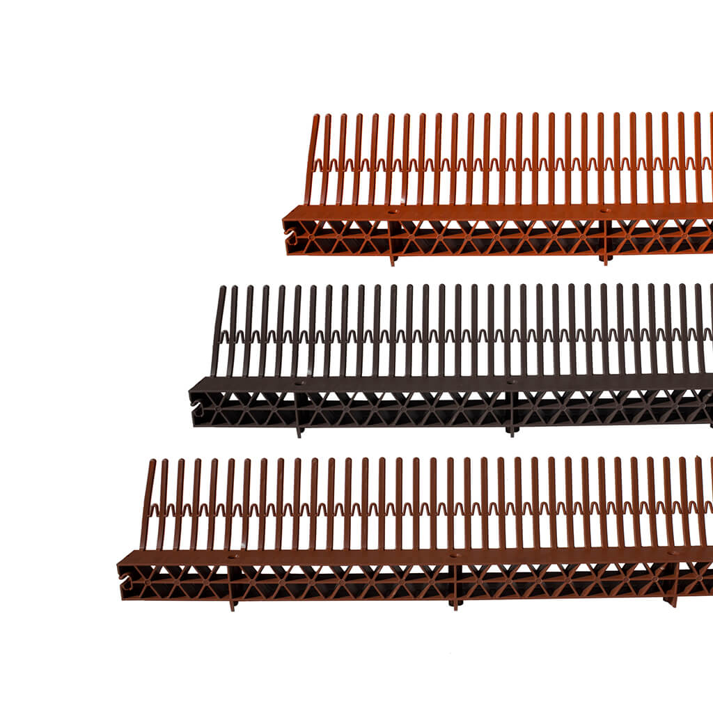 Dieser Lüftungskamm ist besonders bei der Verlegung unter stark profilierten Dachziegeln anwendbar, weil die einzelnen Kämmspikes flexibel miteinander verbunden sind. Am Ende jedes Lüftungskammes befindet sich ein Verschluss, der für eine stabile Verbindung mit den einzelnen Kammelementen sorgt. Spezielle Kanten auf der Unterseite von Traufenlüftungskamm sind für eine schnelle und einfache Installation auf den Rinnenhaken verantwortlich.